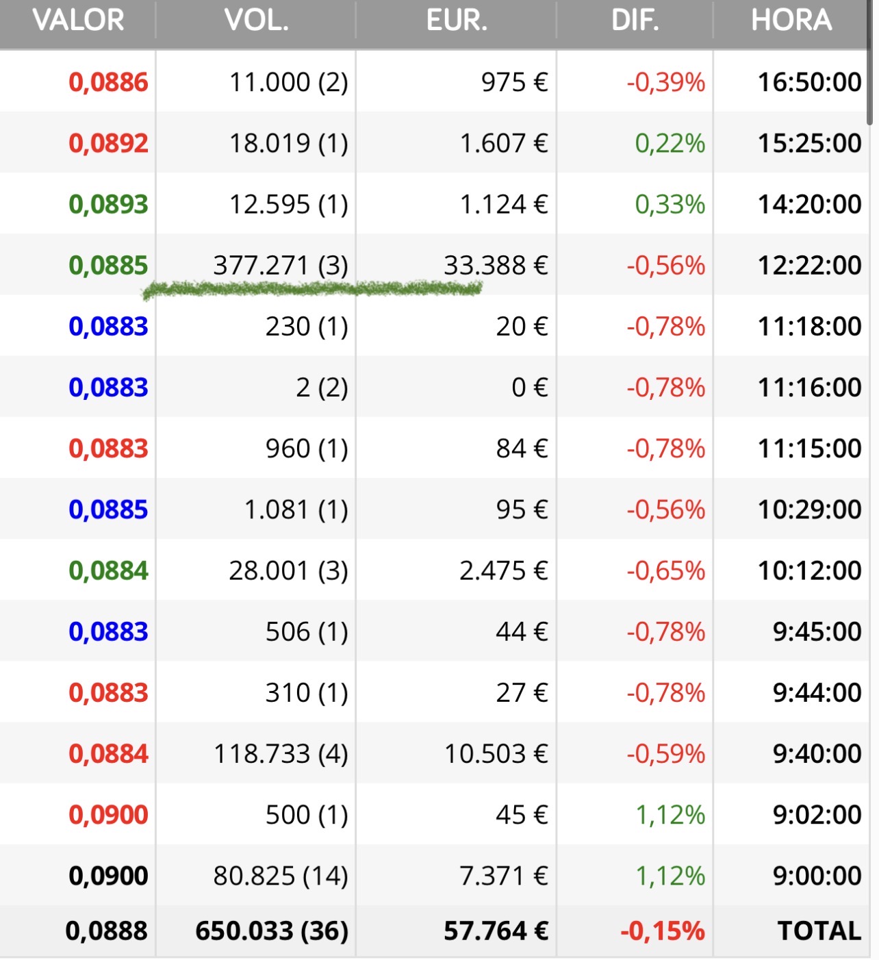no es el momento de promediar, jamás en caídas como estas, solo se puede comprar para especular y, no siempre sale bien. Por eso precaución, otra cosa es lo que se puede intuir que va a suceder, yo creo que superará, no hoy, el 0,19 para ir en busca del 0,20 línea directriz bajista rota.