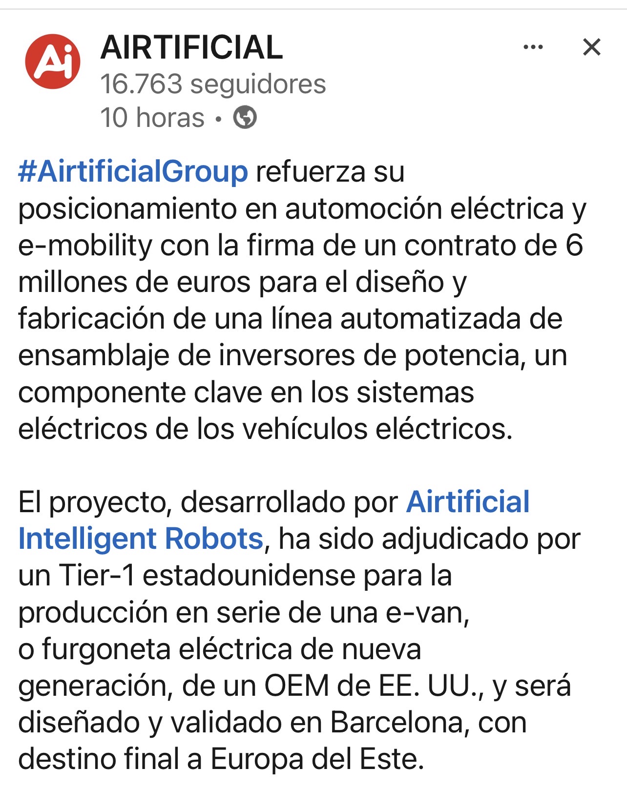 Airtificial es una nueva compañía tecnológica, española y especializada en la aplicación de inteligencia artificial, mediante robótica colaborativa, estructuras sensorizadas y desarrollos de ingeniería, en los tres sectores en los que opera: obra civil, aeronáutica y automoción. Una compañía que nace en la Industria 4.0. con un "know-how" contrastado y presencia en los principales mercados: Europa, Estados Unidos, Latinoamérica y Asia.