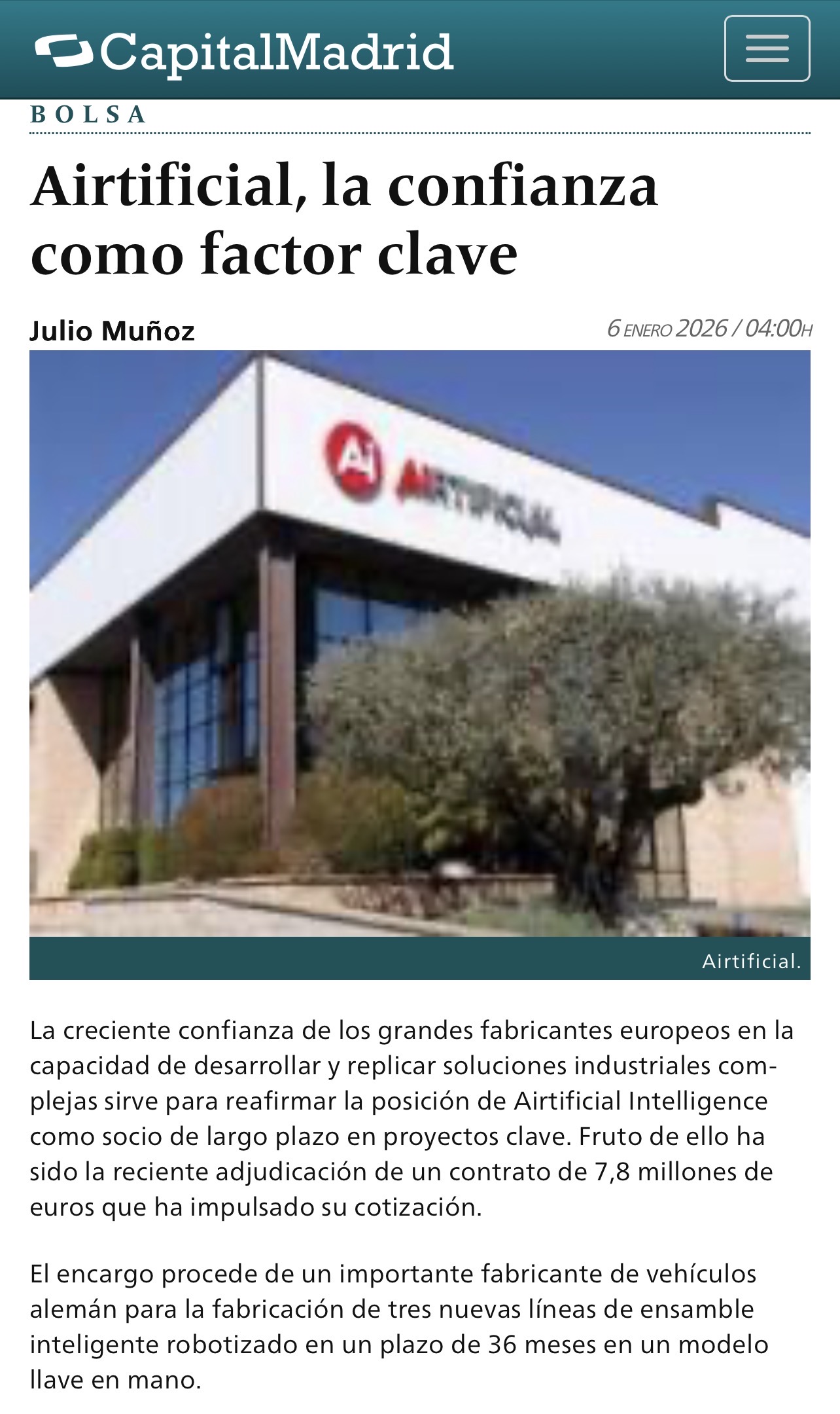 Airtificial es una nueva compañía tecnológica, española y especializada en la aplicación de inteligencia artificial, mediante robótica colaborativa, estructuras sensorizadas y desarrollos de ingeniería, en los tres sectores en los que opera: obra civil, aeronáutica y automoción. Una compañía que nace en la Industria 4.0. con un "know-how" contrastado y presencia en los principales mercados: Europa, Estados Unidos, Latinoamérica y Asia.