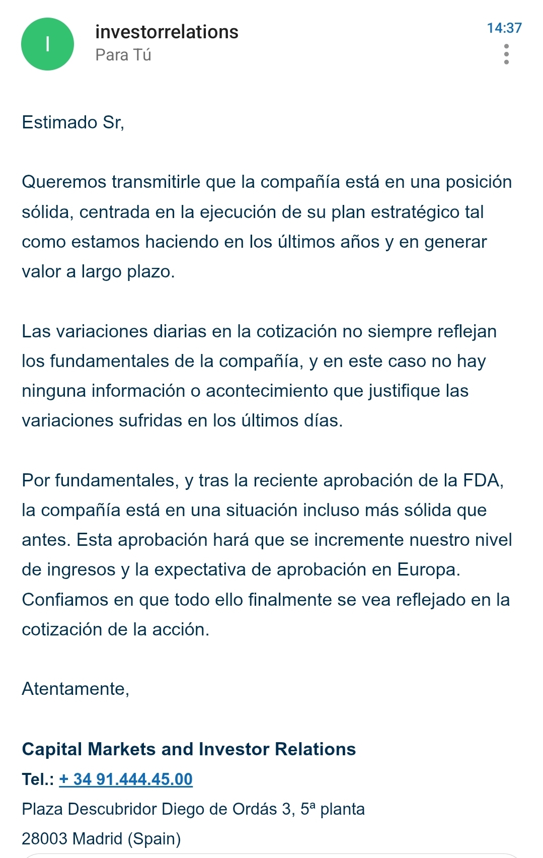 Es que esta bajada no tiene sentido alguno, con el aprobado de la FDA y 50 kilos al bolsillo mas lo que ha de venir, espero que no tarde mucho en darse la vuelta aunque creo que aun nos apretaran algo mas