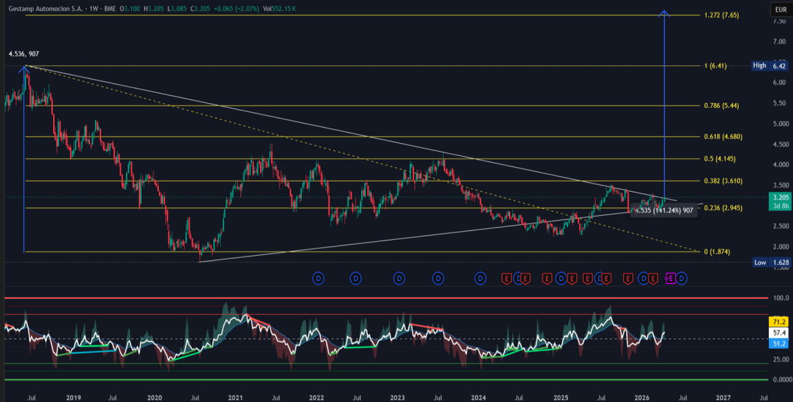 está chocando con la resistencia del triangulo desde máximos, a ver si consigue fuerza en el impulso y lo supera holgadamente, aunque con el Trompetas haciendo de las suyas, el mercado es una montaña rusa