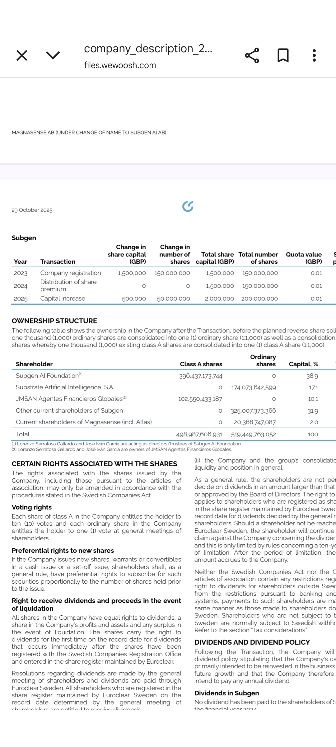 Jmsan y fundación subgen tienen acciones que no cotizan pero que tienen mayor voto. Luego están las acciones de substrate, las nuestras y las que corresponden a la actual magnasense. Las de magnasense son las que cotizan hoy en día más las que le tienen que dar a atlas para compensar su deuda. Pero en total son el dos por ciento.