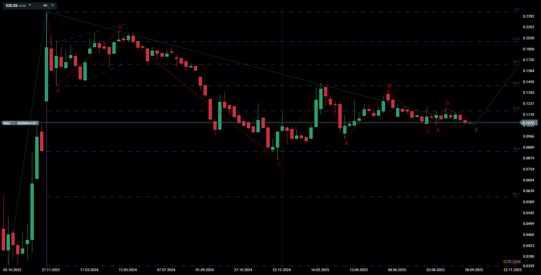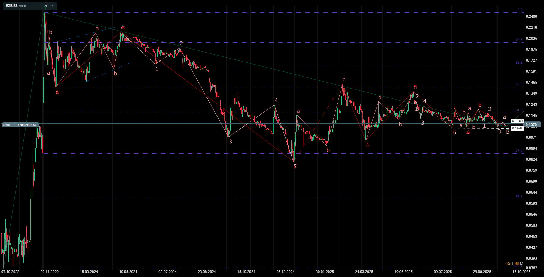 Con vuestro permiso, gráfico de mi punto de vista de EZE. Primero en semanal, donde me queda claro que está realizando una "corrección compleja", estando ahora en la tercera, y enlazadas la uno y la dos por sendas ondas X e Y.