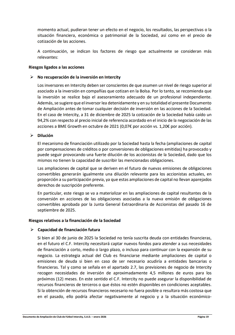 Página 19, obligada lectura"El mecanismo de financiación utilizado por la Sociedad hasta la fecha (ampliaciones de capital...) ha provocado y puede seguir provocando una fuerte dilución de los accionistas de la Sociedad.....""Las ampliaciones de capital que se deriven en el futuro de nuevas emisiones de obligaciones convertibles generarán igualmente una dilución relevante para los accionistas actuales, en proporción a su participación previa,.....""Este riesgo se va a materializar en las ampliaciones de capital....aprobada por la Junta del pasado 16 de septiembre 2025"