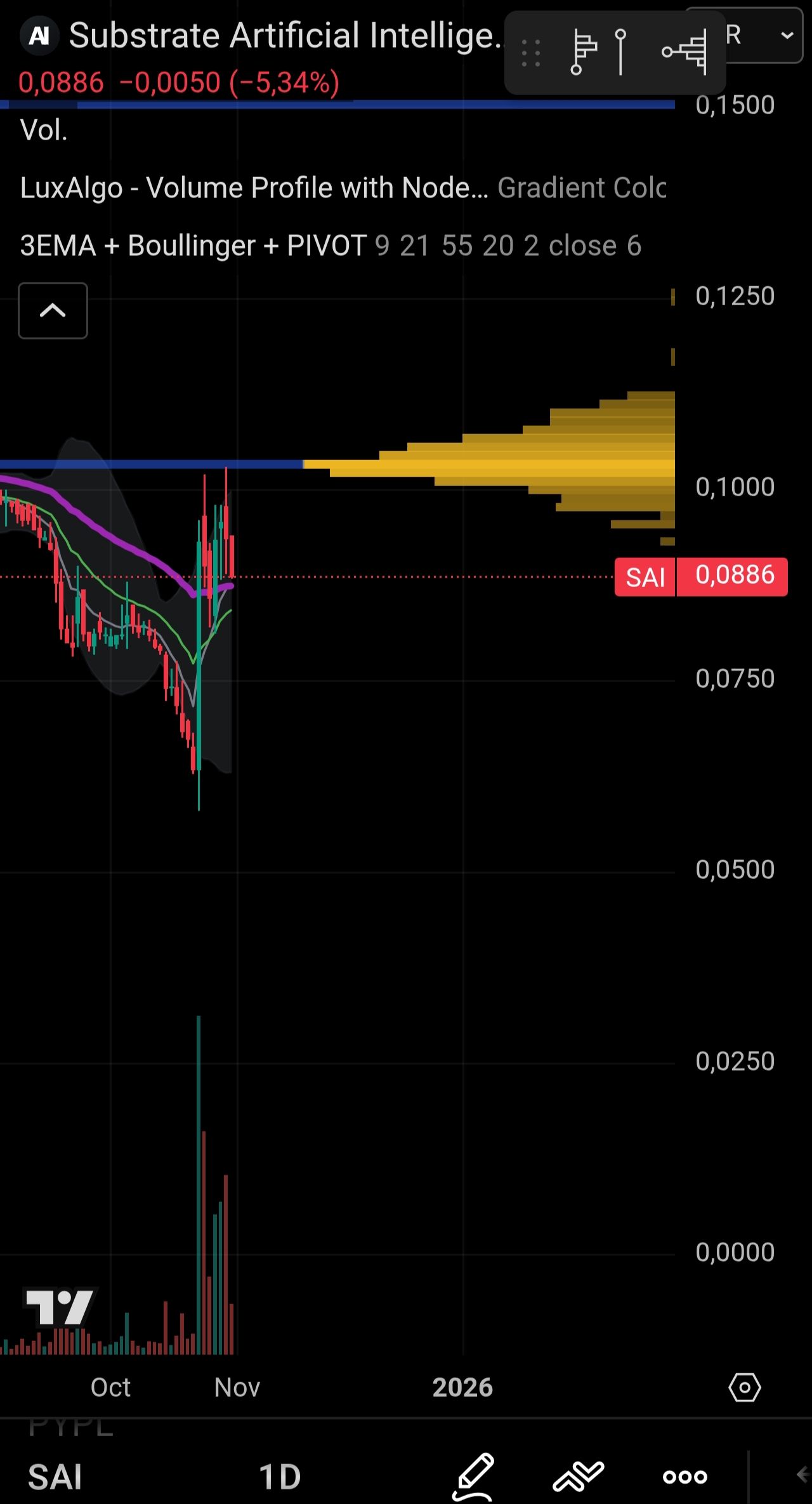 Aún colgando de un hilo... Al menos aguanta ema 55... Lo malo es rechazo al nodo de volumen en 0,1............