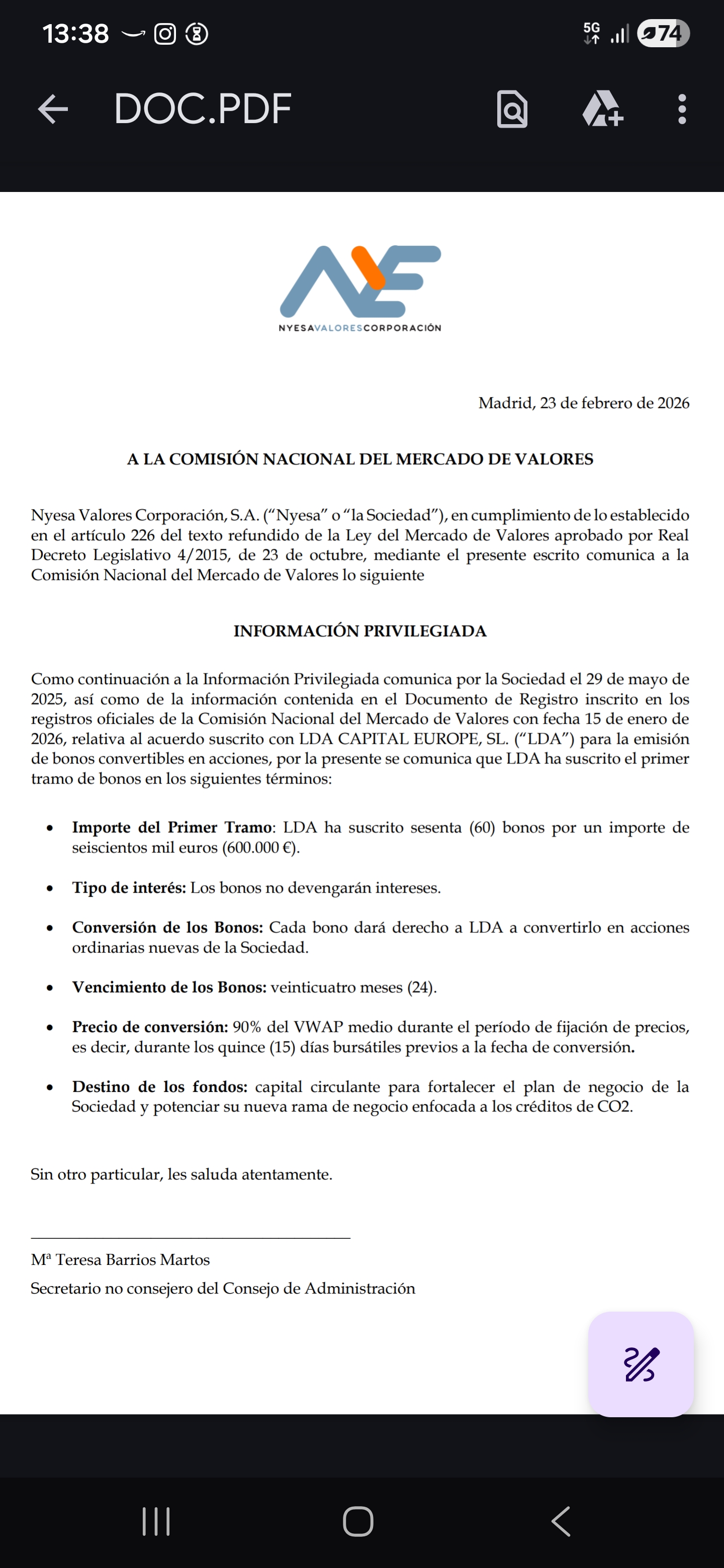 ?Para el mercado: Indica que durante los próximos 24 meses puede haber una presión vendedora constante, ya que el inversor irá soltando acciones nuevas al mercado a medida que ejecute la conversión de sus bonos.